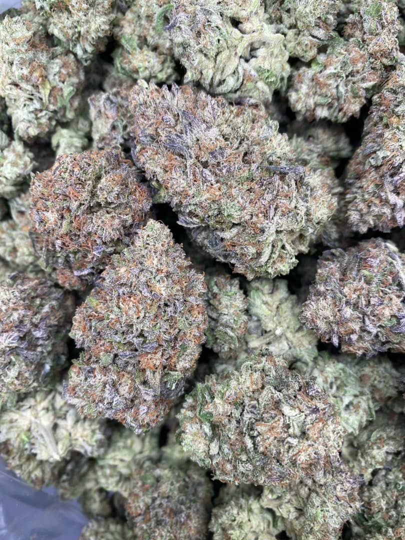 Die Blüten der Cookie Monster Strain sind dicht und klebrig, mit einer resinartigen Oberfläche. Sie präsentieren sich in dunkelgrünen und violetten Farben, mit auffälligen orangen Pistillen und einer dichten Schicht Trichome, die einen fast frostigen Glanz verleihen.